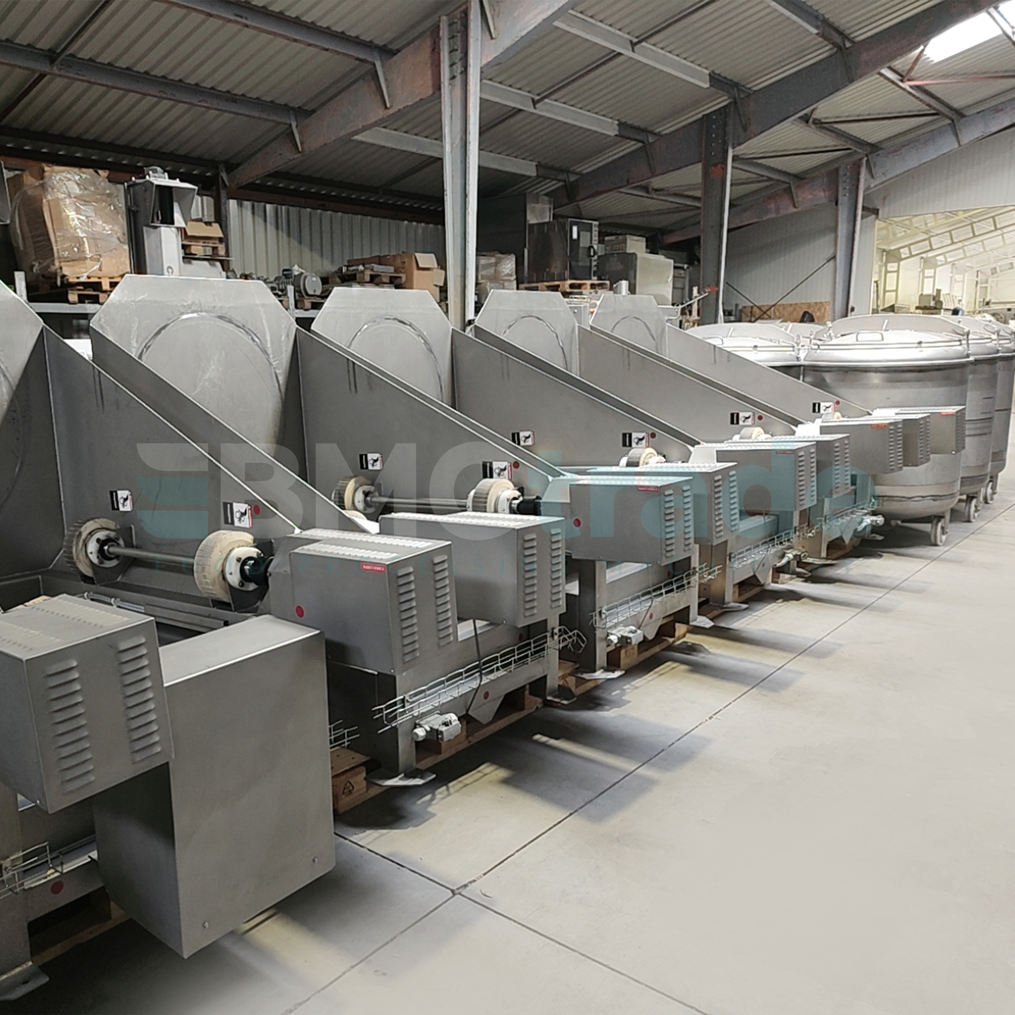 Maszyny pracują przy zasilaniu 400V, 50 Hz, 3N, a regulacja obrotów realizowana jest mechanicznie – operator może łatwo dobrać prędkość do rodzaju produktu i wymaganej intensywności masowania. Kompaktowa forma pozwala na ustawienie zestawu w istniejących pomieszczeniach produkcyjnych bez dużych przeróbek linii.