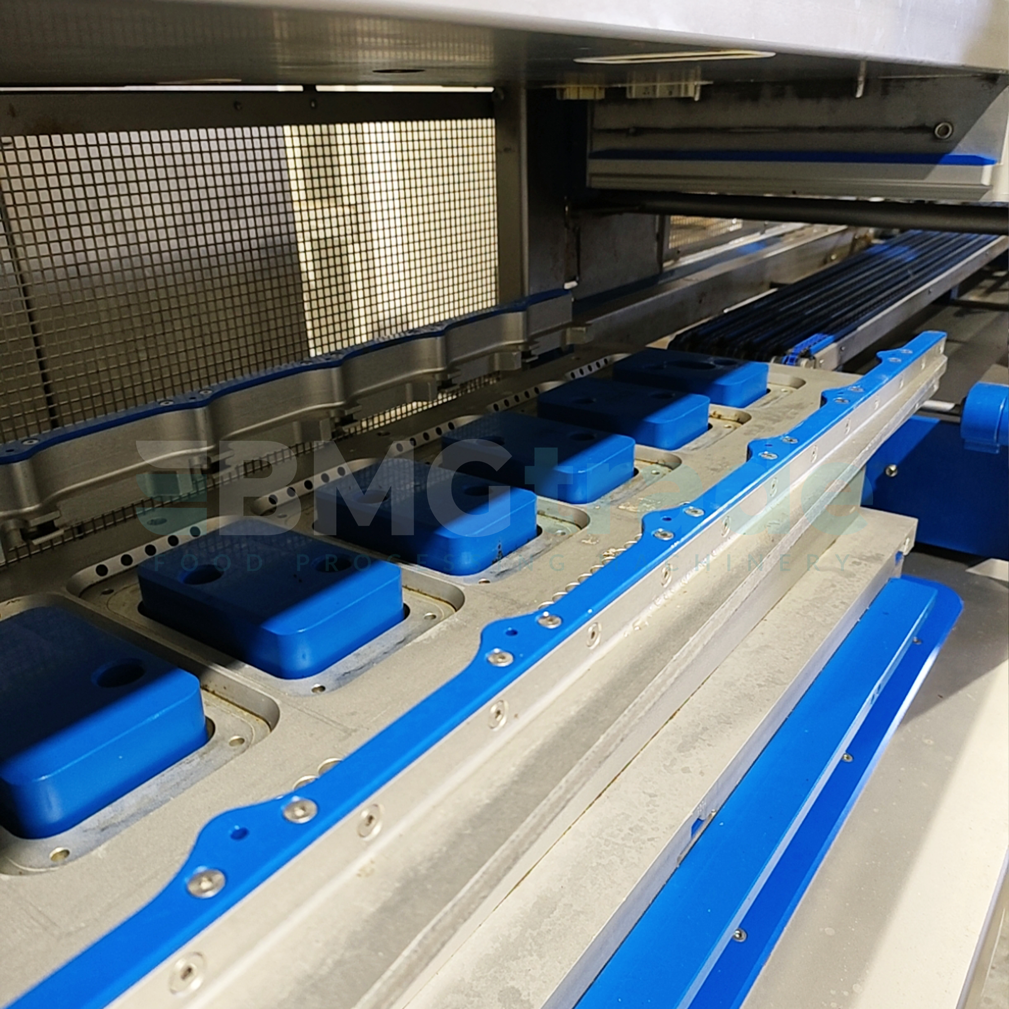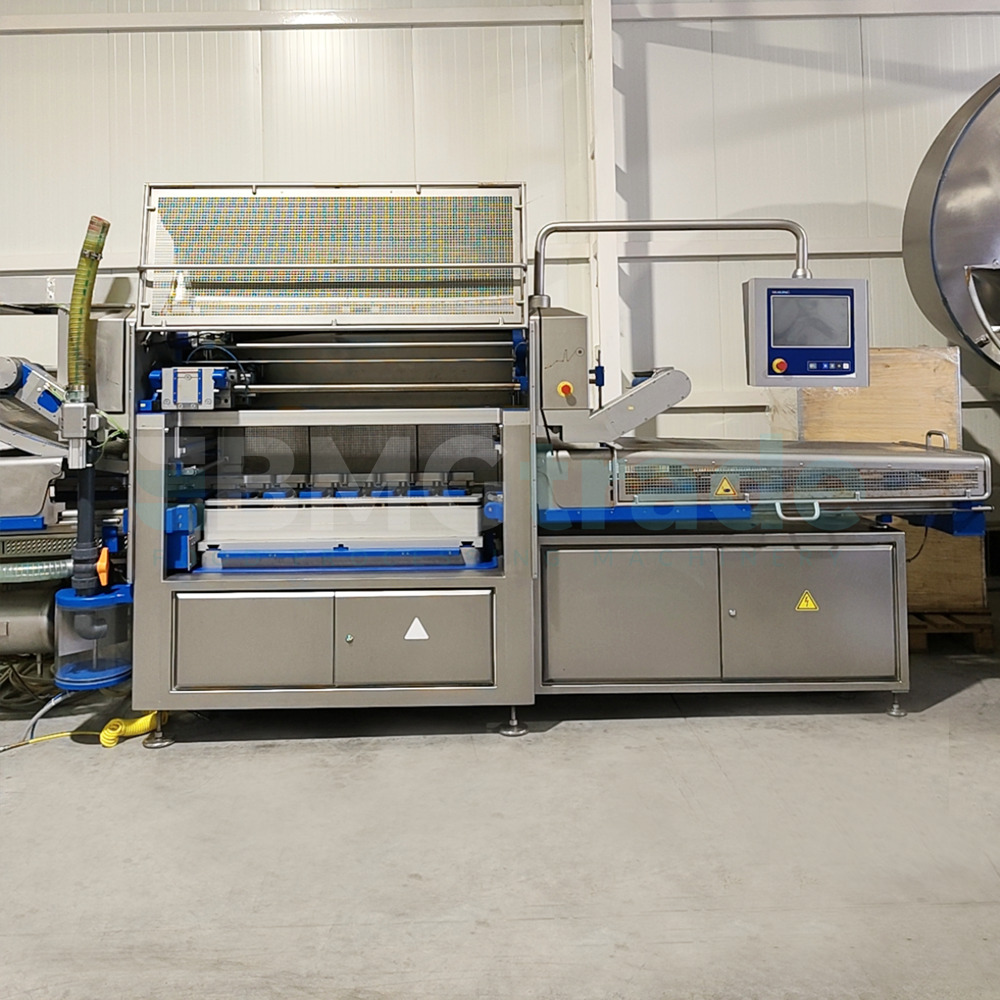 Maszyna pracuje w standardzie 400/230V 3Ph/N/PE, 50 Hz, o mocy 12 kW. Duża długość robocza (wymiary maszyny 11300 x 1100 x 2200 mm) oraz dwie taśmy transportowe zapewniają płynny przepływ produktów, a dwa wózki na formy ułatwiają szybką zmianę asortymentu i organizację pracy. Do zestawu dołączona jest pełna dokumentacja techniczna oraz komplet części zamiennych, co dodatkowo obniża koszty wdrożenia i serwisu.